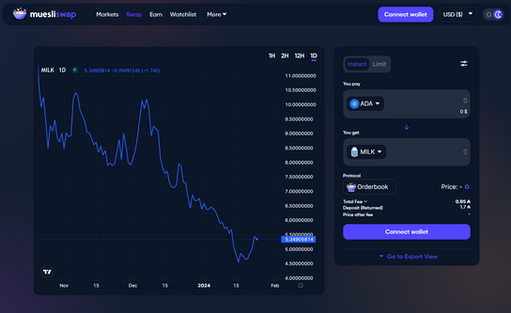 MuesliSwap is a decentralized exchange (DEX) on the Cardano blockchain that enables you to trade Cardano native tokens.